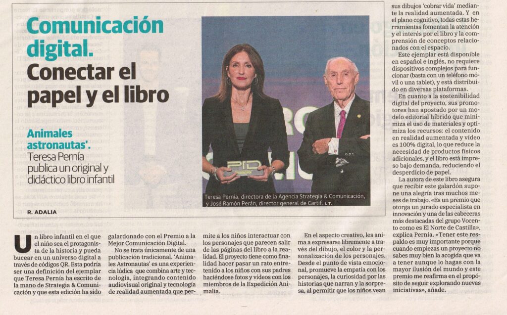 Los Premios Innovación de El Norte de Castilla son portada del periódico y protagonizan un Especial con toda la información sobre los premiados. El premio otorgado al libro “Animales Astronautas” protagoniza el artículo Comunicación Digital. Conectar el papel y el libro.